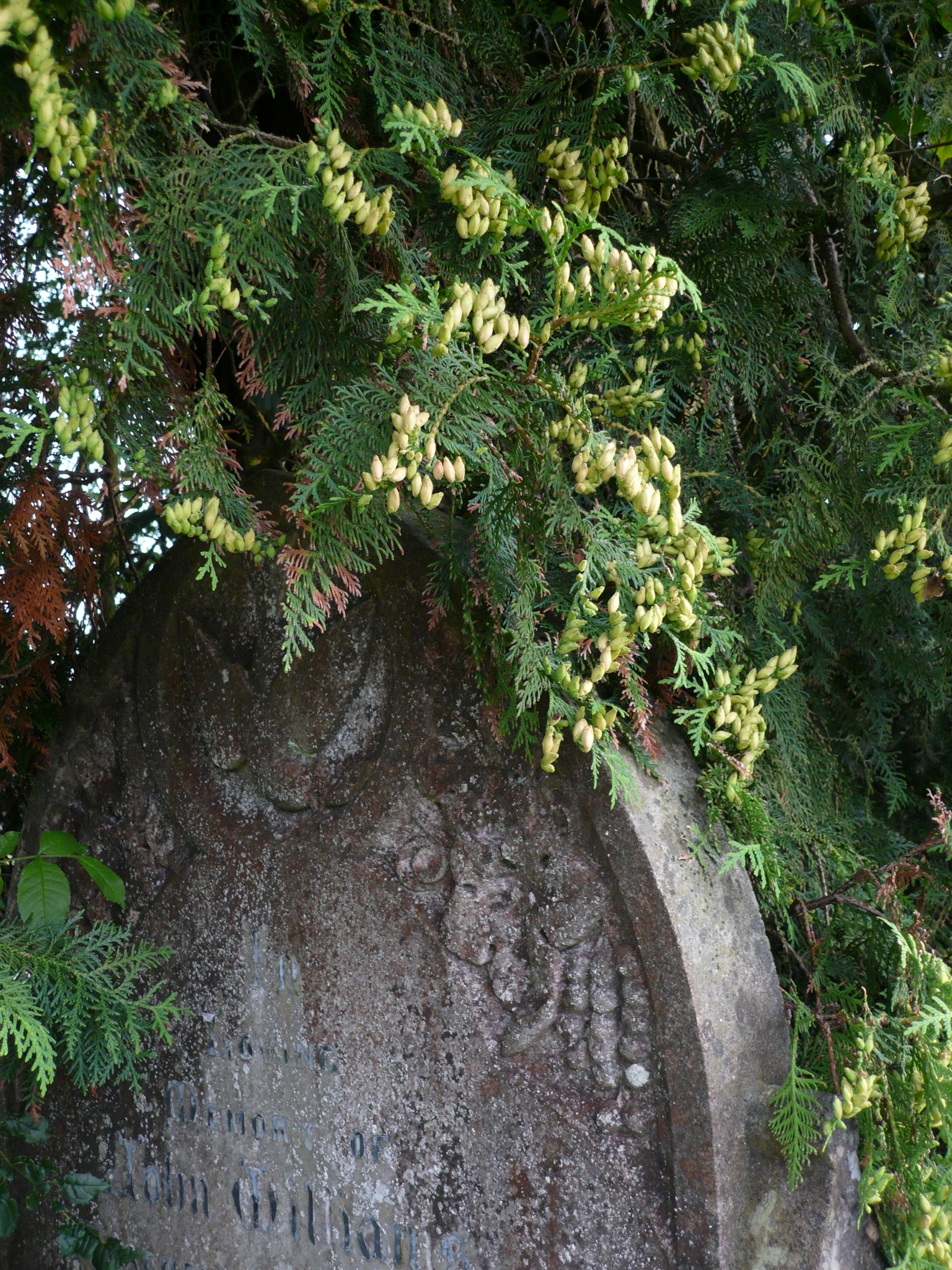Under the green candled boughs of the arbor vita,